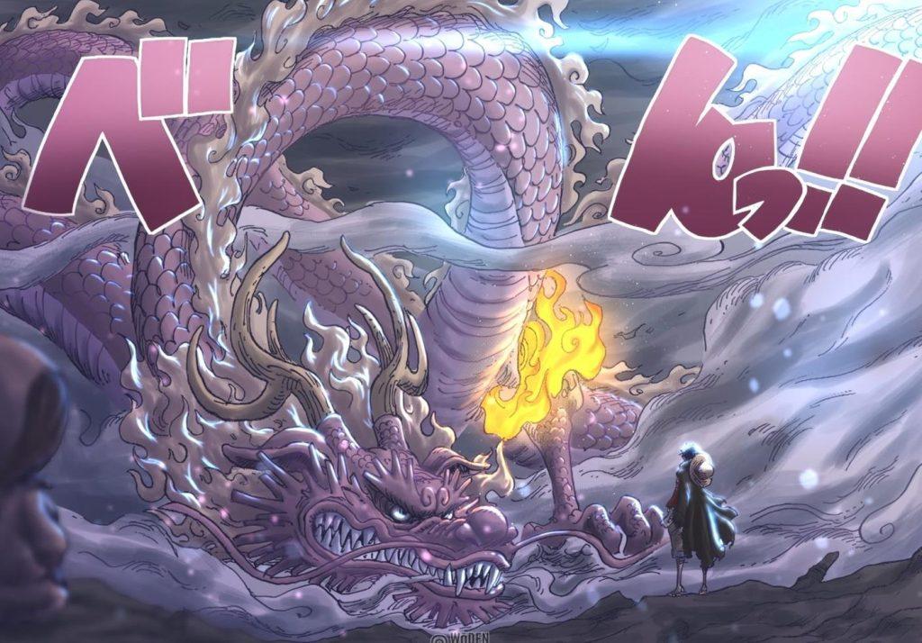 Alors que Kaido pleure, Luffy se dirige vers lui alors qu’il se transforme. Kaido reçoit un coup de poing rapide avec le Haki des rois au visage.